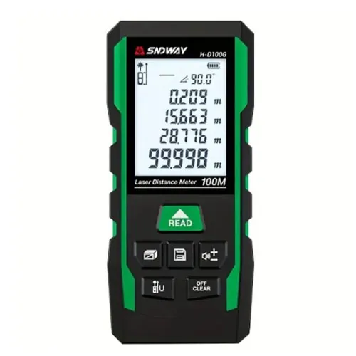 Máy đo khoảng cách SNDWAY H-D100G màn hình LCD đèn nền quan sát số liệu ngay điều kiện ánh sáng yếu và đo khoảng cách laser ngoài trời tốt dưới ánh nắng mặt trời. Sndway H-D100G dùng để đo khoảng cách, tính diện tích, thể tính… nhanh chóng và cho độ chính xác cao.